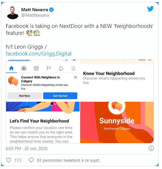 Facebook pourrait prochainement vous aider à briser la glace avec vos voisins. Le réseau social est en train de tester une nouvelle fonctionnalité, Neighborhoods (littéralement « quartiers »), pour vous permettre d’accéder à des publications, des groupes, ou des objets du marketplace vendus dans votre voisinage.