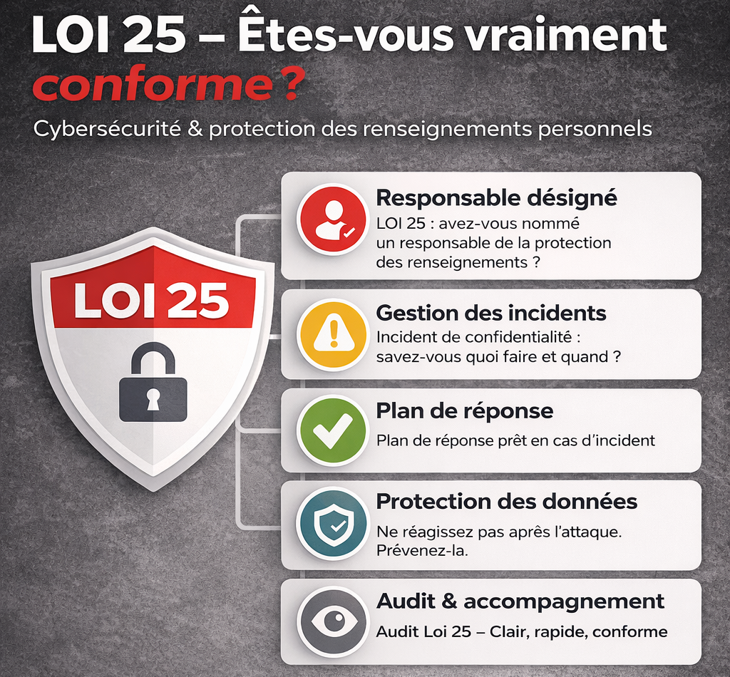 L’annonce a été faite à l’automne 2024. Depuis septembre 2024, la Loi 25 est pleinement en vigueur et s’applique dans son entièreté aux entreprises et aux organismes québécois.